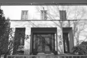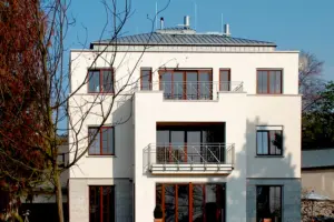 Klassischer symmetrischer Zuschnitt mit anspruchsvollen Raumfolgen + Durch-blicken innerhalb des Hauses und nach draußen. Beste Ausstattung mit hochwertigem Naturstein- und anspruchsvollen Wand-Belägen, geschosshohen Holztüren und wertvollen Schrankeinbauten. Kunstschlosserarbeiten innerhalb des Hauses und an den Brüstungen der Balkone ergänzen die handwerkliche Bestleistung. Die Fassadengestaltung wird geprägt von einem Wechsel von Lochfenstern und großen Verglasungen in den Wohn- und Schlafräumen und der horizontalen Zäsur der drei Ebenen. Sockelgeschoss zum Garten mit Natursteinverkleidung, EG abgesetzt mit umlaufenden Naturstein-Fensterbank, dazwischen Putzfassade und Obergeschoss mit Feinstruktur Putzoberfläche. Die Fenster sind eingefasst mit Natursteinstreifen und dadurch betont, die Dachfläche mit flacher Dachneigung in Zinkblech als Zeltdachkonstruktion.