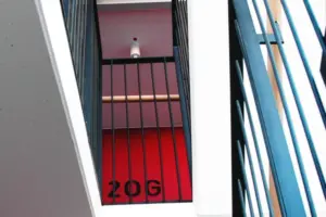 Konzept Einpassung in die Baulücke nach funktionalen Aspekten mit einer dreifachen Grobgliederung der Fassade, Gerichtsräume und Säle im EG + OG, Büros in vier Geschossen darüber und die Leitung + Verwaltung im zurückspringenden Dachgeschosses. Verkleidung der Tragkonstruktion mit Natursteinplatten. Zentrale Erschließung mit Aufzügen und Treppenhaus von der Straße aus; die Tiefgarage, Technik- und Lager- Räume im Untergeschoss sind zusätzlich über Hausdurchfahrt erreichbar.