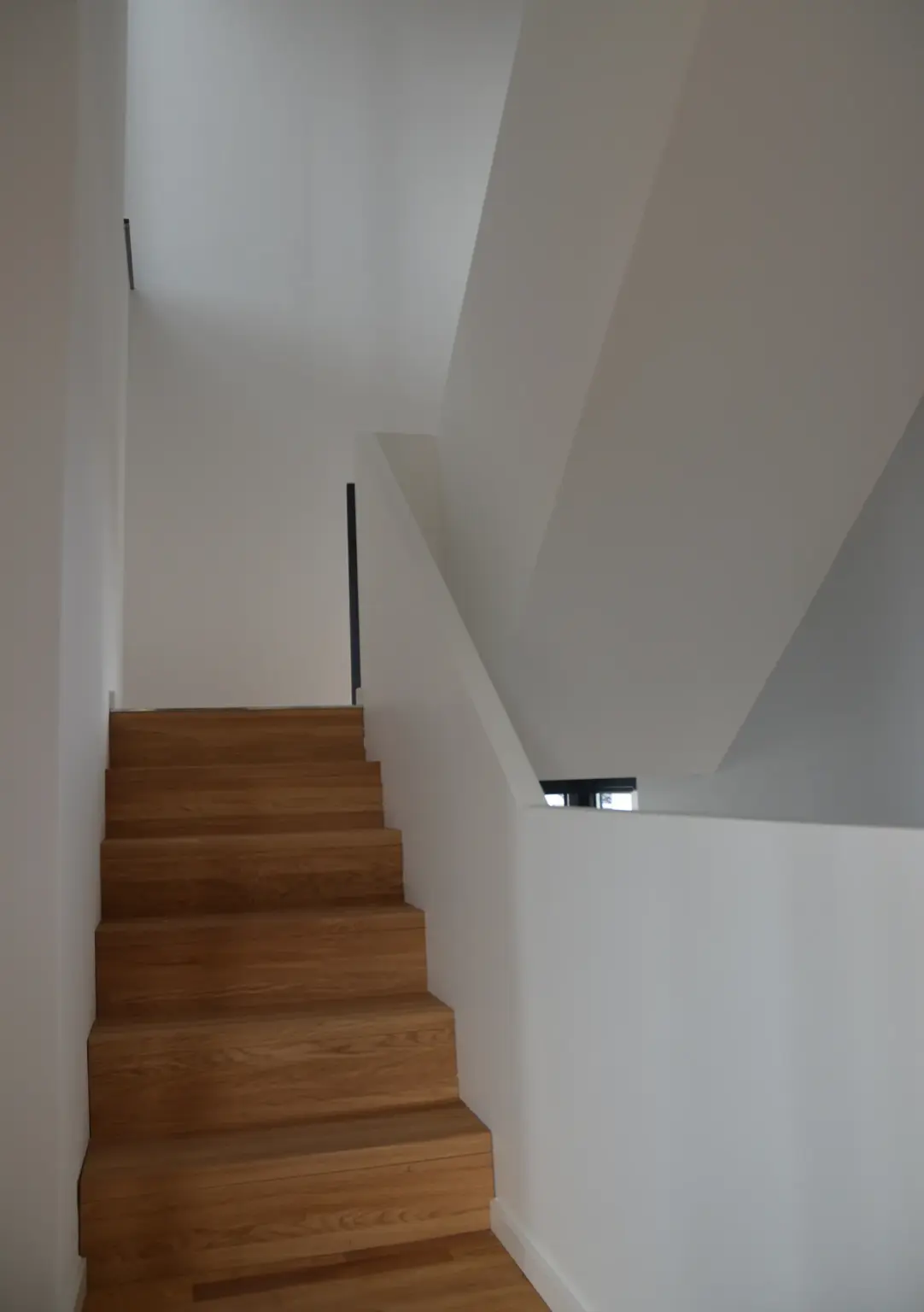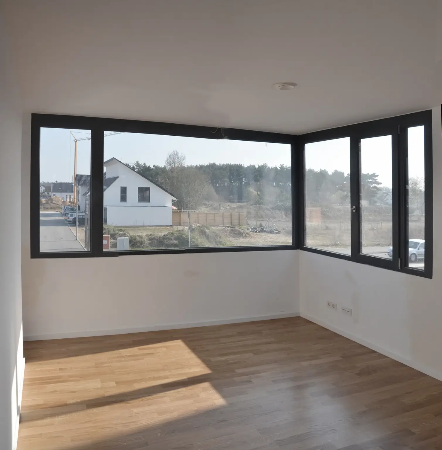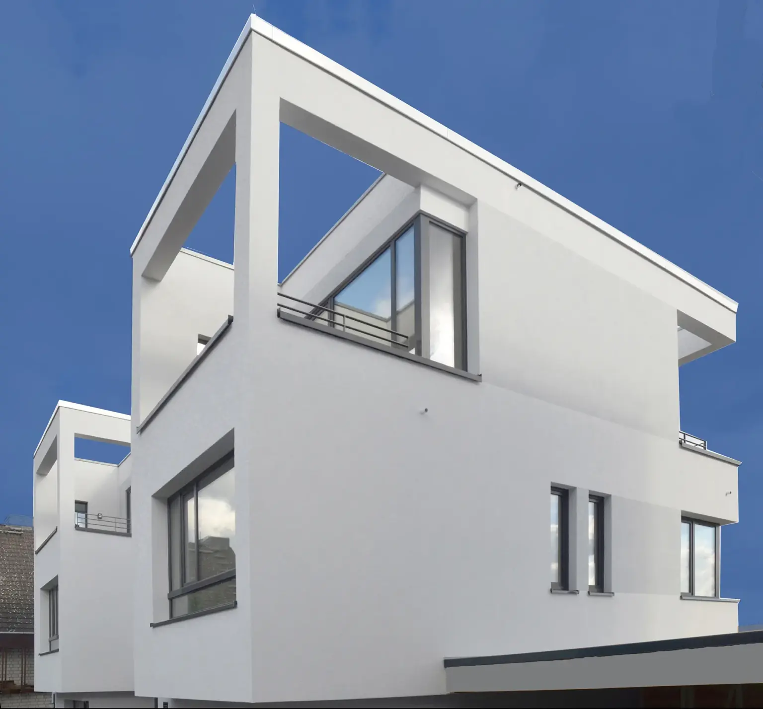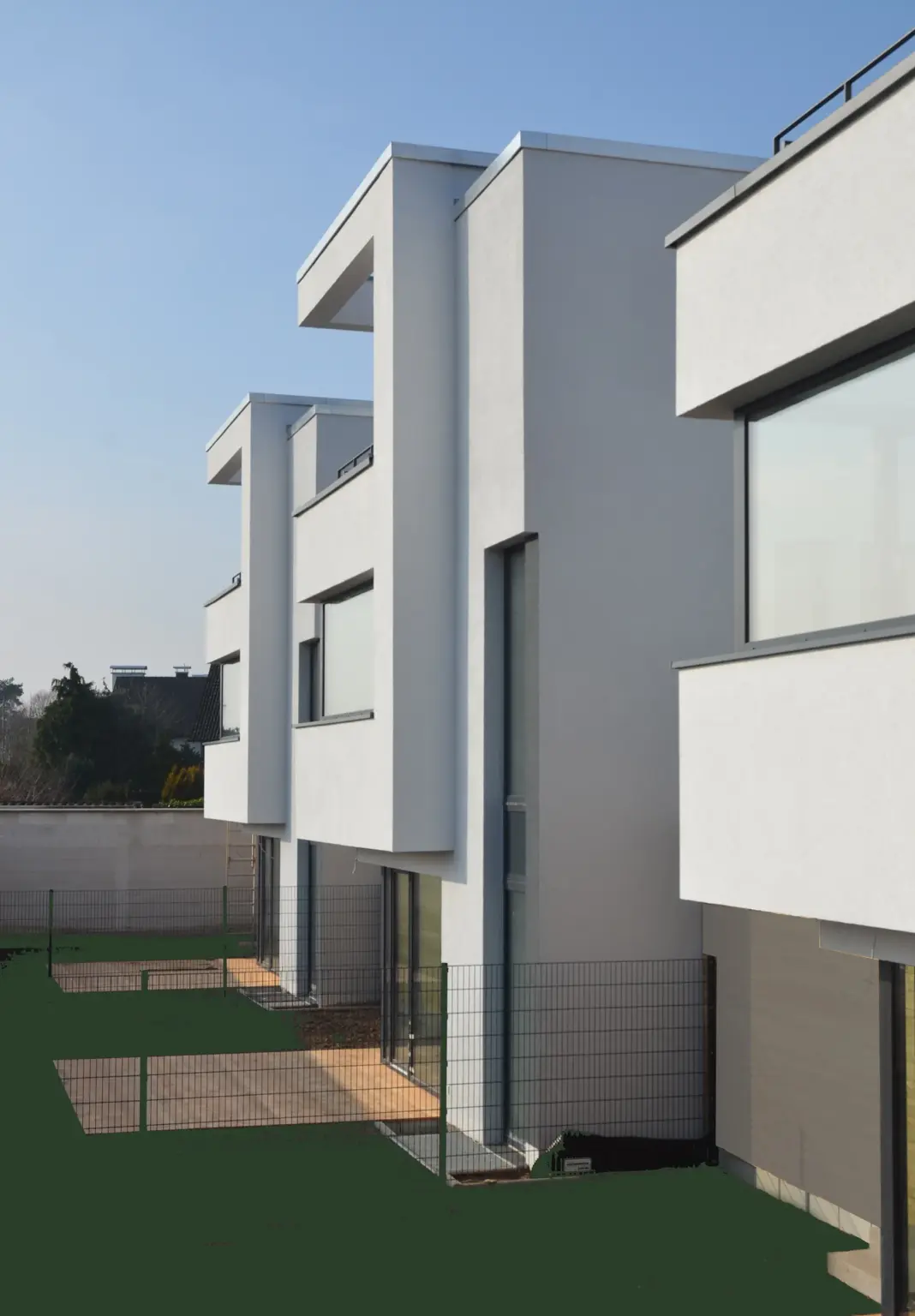 Drei identische, moderne Stadthäuser in kubischer Bauweise mit weißer Fassade und Übereck-Fenstern hinter einer hohen grünen Hecke.