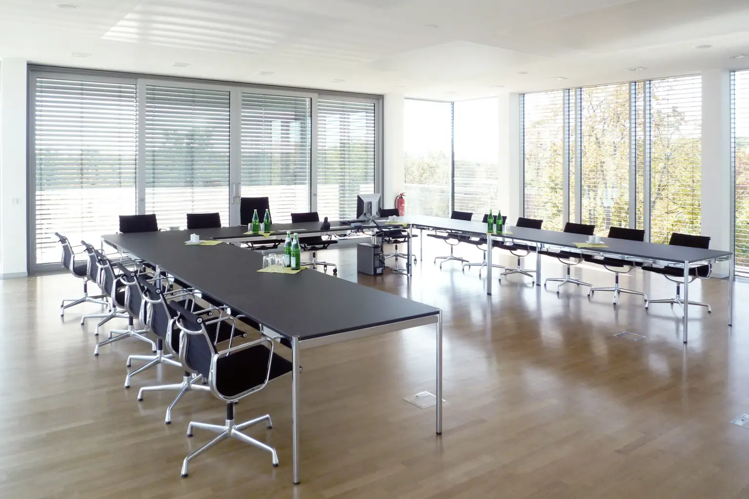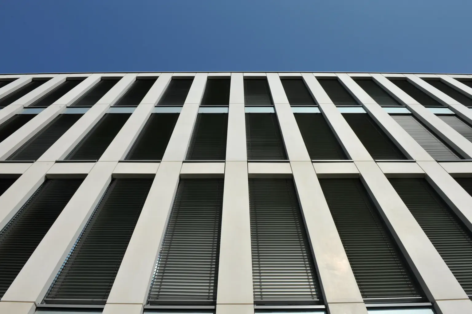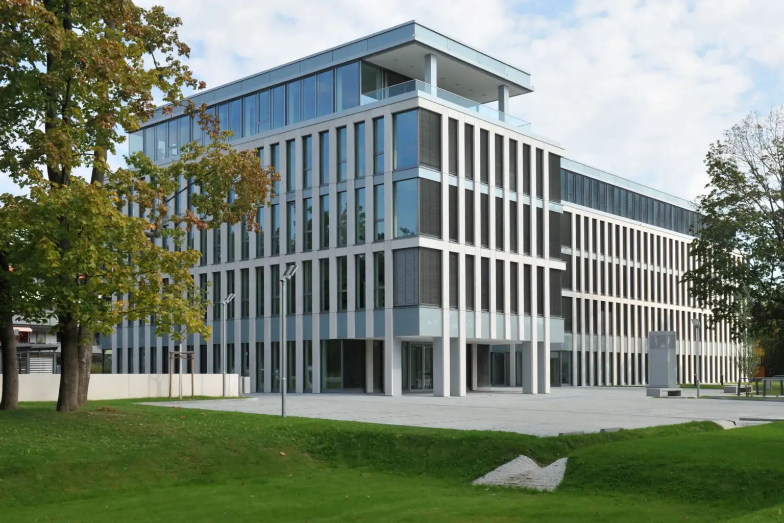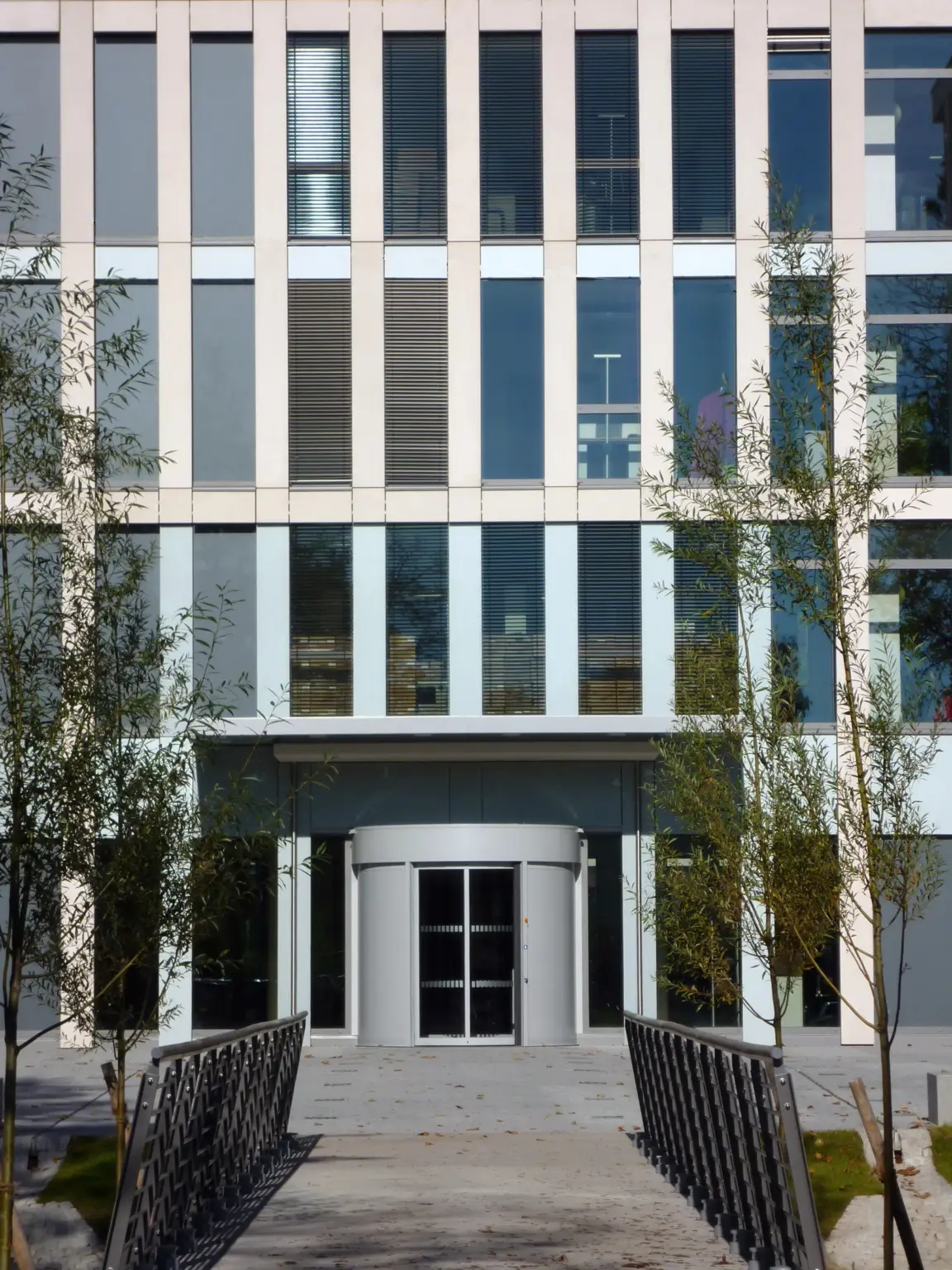 Symmetrische Frontansicht eines modernen Bürogebäudes mit Glasfassade und Außenjalousien, erreichbar über eine stählerne Fußgängerbrücke.