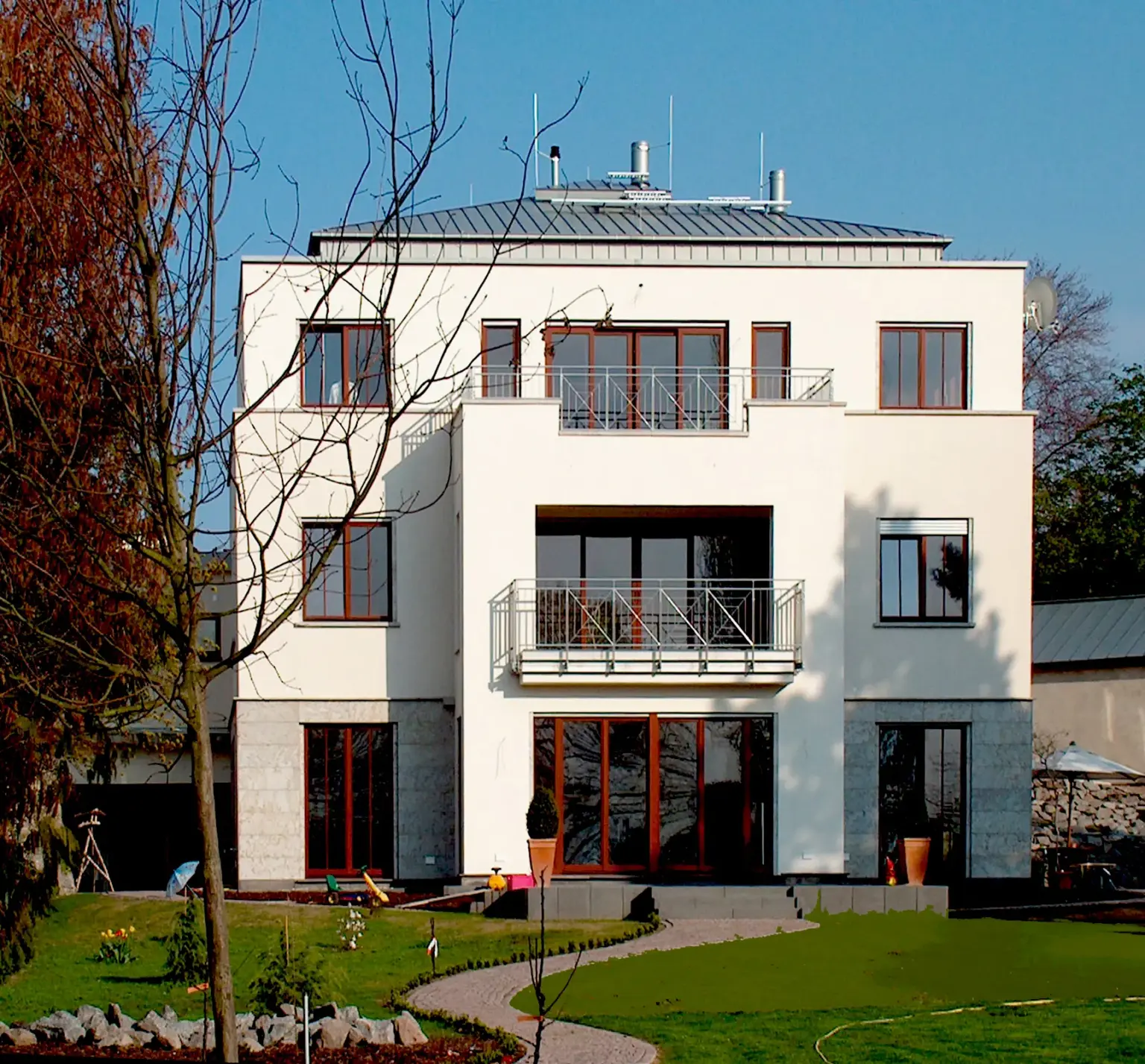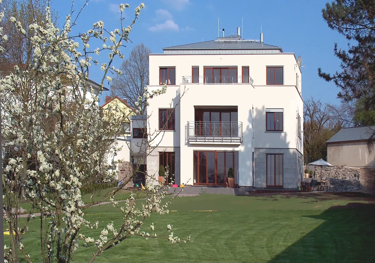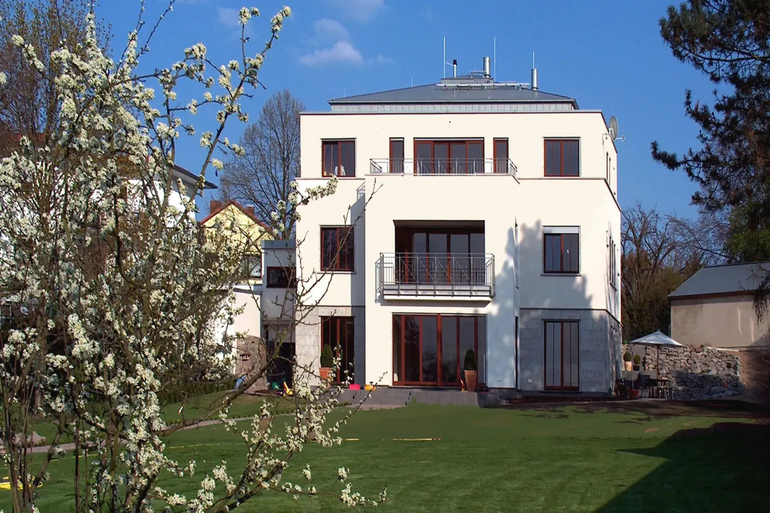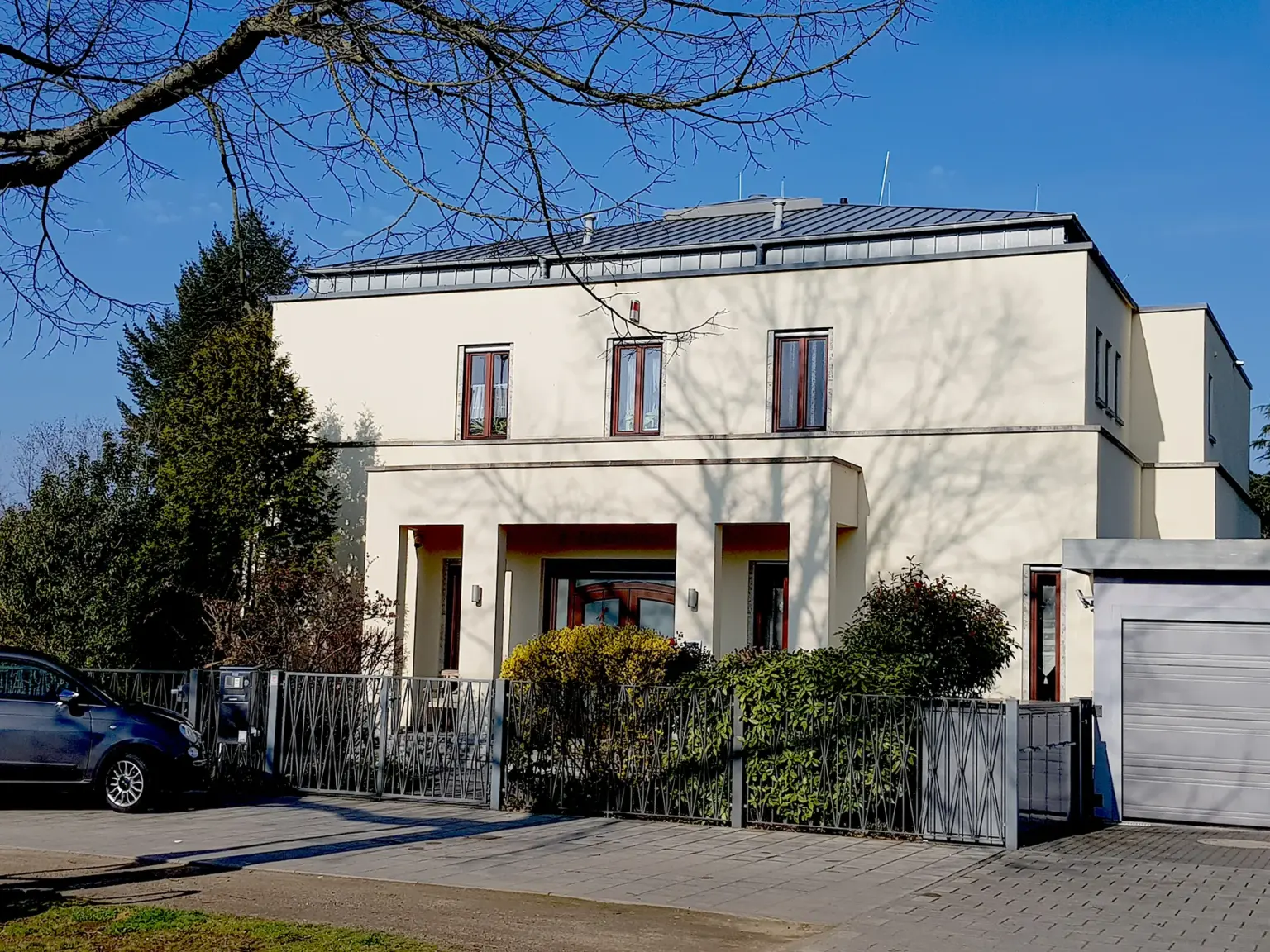 Klassisch-moderne Stadtvilla mit hellgelber Fassade, symmetrischer Fensteranordnung und einem gepflegten Vorgarten mit altem Baumbestand.